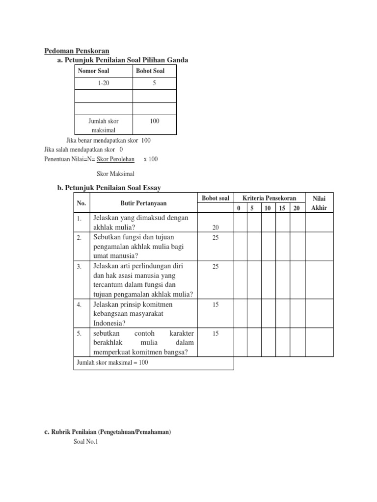 Pedoman Penskoran A Petunjuk Penilaian Soal Pilihan Ganda