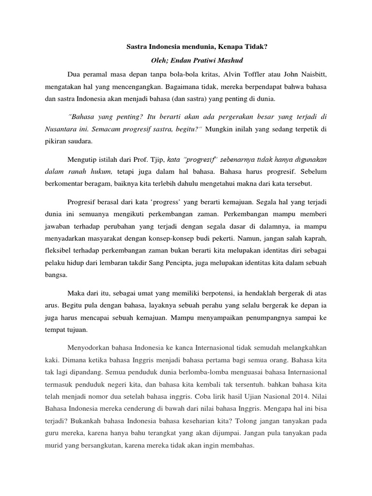 Esai Sastra Indonesia Mendunia Kenapa Tidak Endan Pratiwi Mashud